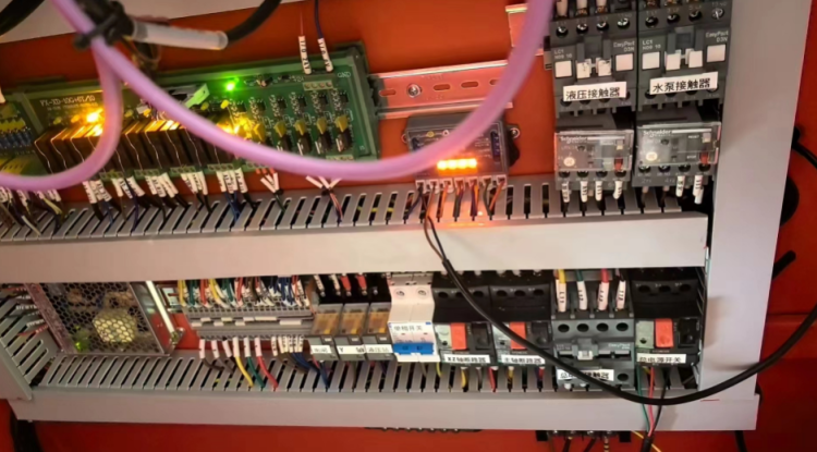 1、液压站无反应,无压力。沐鸣2 检查电箱,液压站的控制器电路正常,继电器正常工作,但是液压站没有反压,电机不转,初步判断是液压站电机没有进电,这里沐鸣2 首先去检查了继电器,工作正常,判断有可能急停开关的控制有问题,急停后液压站会不工作,沐鸣2 拆看面板发现面板的急停开关无异常,后检查电箱发现确实是信号线路松脱,拔插过后问题解决。